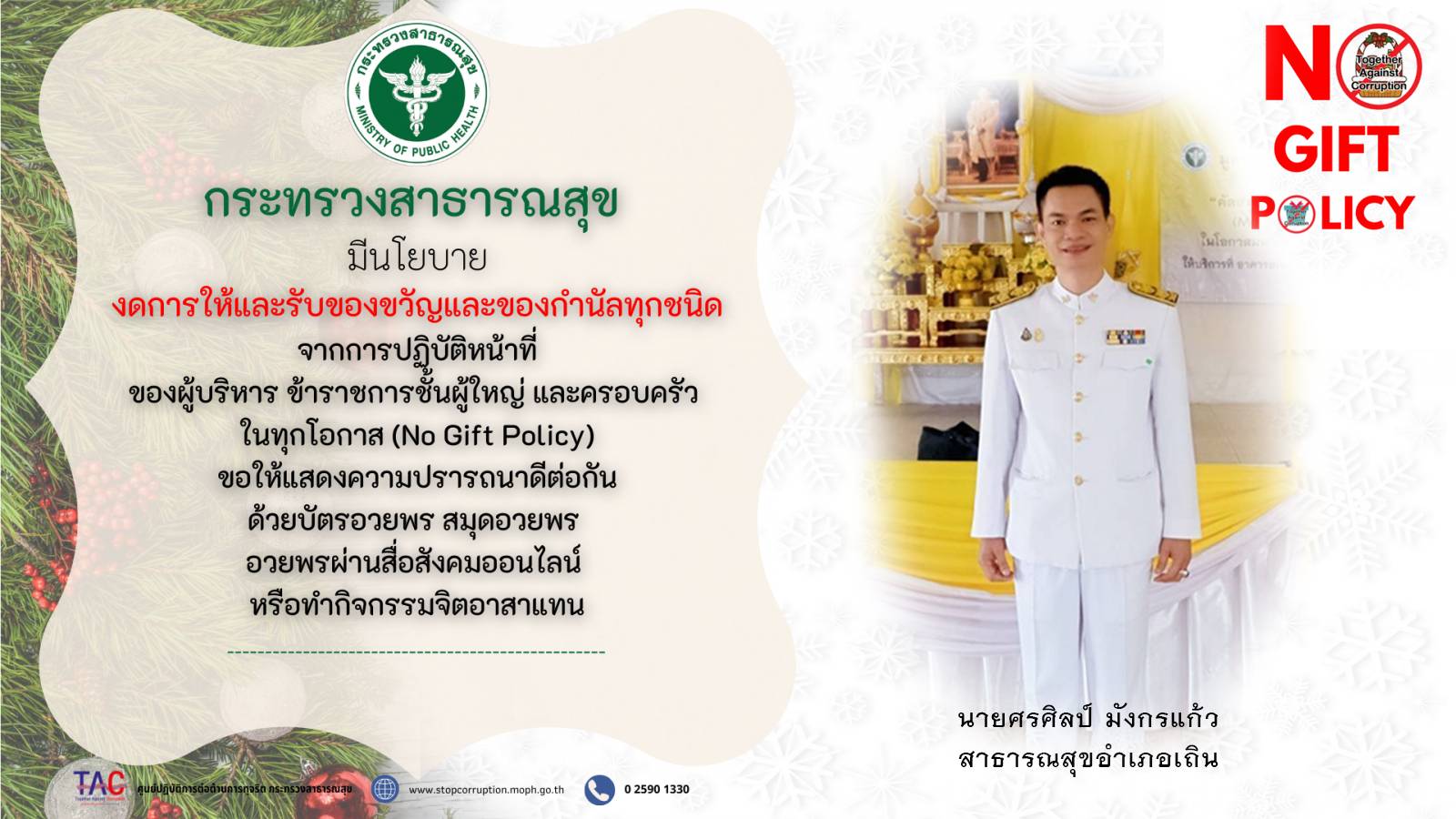 1.มีประกาศเจตนารมณ์เป็นหน่วยงานที่เจ้าหน้าที่ของรัฐทุกคนไม่รับของขวัญและของกำนัลทุกชนิดจากการปฏิบัติหน้าที่ (No Gift Policy) ของปีงบประมาณ 2569 ที่มีลักษณะเป็น Infographic No Gift Policy ในนามหัวหน้าหน่วยงาน