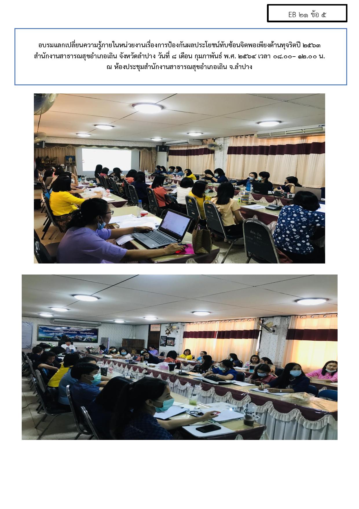 ITA2564 EB 21 ข้อ 5 ภาพถ่ายการจัดกิจกรรมการประชุมแลกเปลี่ยนความรู้ภายในหน่วยงานการป้องกันผลประโยชน์ทับซ้อน ปี 2563